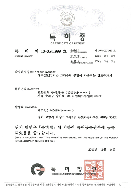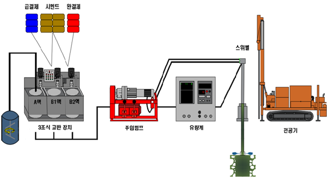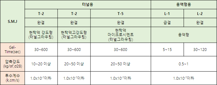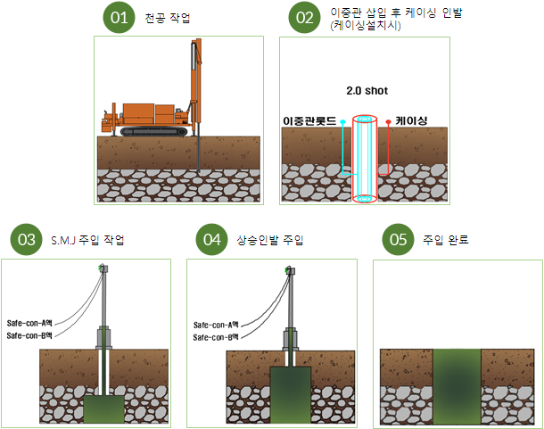 현장에서 자성 이온화 고결정 실리케이트 제조장치를 직접 사용하여 만들어지는 고결정의 실리케이트로 친환경 주입재인 S.M.J를 사용함으로써, 내구성은 물론 침투성의 효과가 한층 더 상승되었고 그동안 기존 주입재들의 문제점이었던 주입 고결체의 용탈현상에 의한 지하수 오염, 내구성저하, 강도저하, 오염 침출수 확산 방지를 위한 내산성과 내염성 확보 등의 어려운 문제점들을 친환경 주입재로 모두 해결한 한층 더 향상된 공법이다. 또한 점토층에 주입이 어려운 점을 감안하여 Air Compressor를 사용하여 할렬 맥상은 물론 침투주입 되도록 한 공법이다.