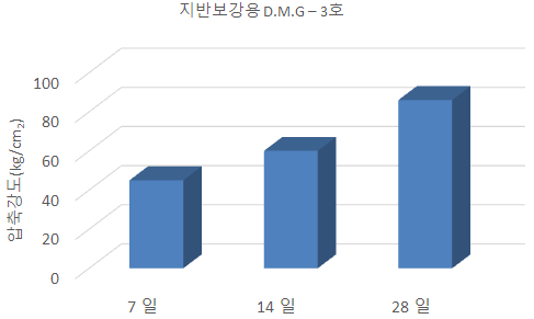 지반보강용 D.M.G 1호 ~ 4호는 호수마다 3가지의 배합이 있으며 4호까지 있으므로 총 12가지의 표준배합이 있으나, 다음의 일축압축강도 시험은 12가지 중 가장 강도가 낮은 1-1호를 나타 내었다.