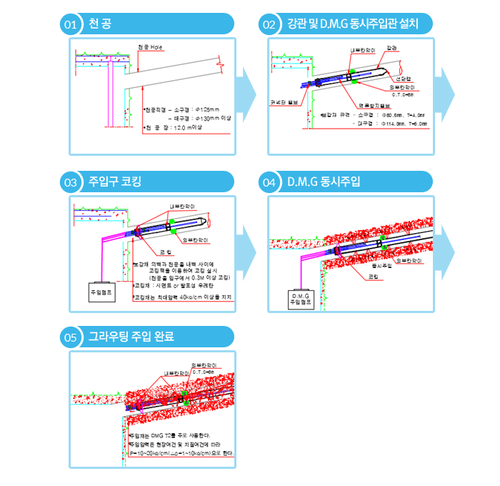 신기술(NET) 및 혁신제품(KIP) DMG 무수축 조절재(B액)과 DMG 드럼 자성 이온화 수용액(A액)의 믹서기 내부 회전통 자석의 자기장에 의한 마찰력과 와류 현상으로 균일하게 믹서가되어 이온화가 되었고 서로 결합(A+B)하여 한층 더 이온의 활성화로 분자간 결합력이 극대화 되어 무수축 고결물이 형성되므로 용탈,용출 방지 및 내염성과 내산성 확보로 장기적인 내구성이 구축되었다. D.M.G 동시주입 강관다단 주입시 코킹할 때 Cotton패카를 사용하게 되어 시공이 간편하고 코킹시간이 단축되었으며, D.M.G 동시주입 강관 외부에 코튼패커식 외부칸막이 패커를 1개이상 설치하여 씰링없이 본주입이 가능하게 되어 시간이 단축됨과 동시에 시공도 간편하게 되었으며, 마찰력 증대로 압력이 분산되어 D.M.G동시주입 강관의 밀림현상을 방지하여 시공시 안전에 효과가 크고 D.M.G무수축조절제인 T2, T5 사용으로 6~12시간 이내에 1.7~2Mpa이상의 강도발현으로 공사기간을 단축하게 되므로 경제성과 보강효과를 개선한 터널 강관다단 보강공법이다.